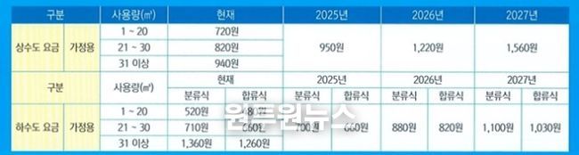 상하수도 요금은 2018년 이후 동결돼 왔으나, 2025년부터 2027년까지 3년간 단계적 인상이 추진된다.