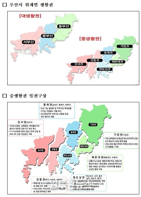 2040 부산도시기본계획상 ▲‘대생활권’은 서·중·동부산권으로 ▲그 아래 ‘중생활권’은 강서·강동·동래·원도심·기장·해운대권으로 나뉜다.