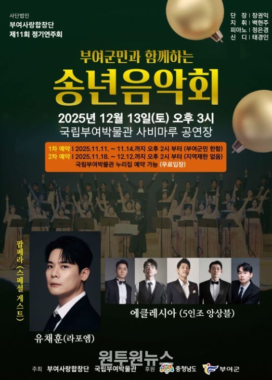 (원투원뉴스) 부여군은 (사)부여사랑합창단 주최로 오는 12월 13일 오후 3시, 국립부여박물관 사비마루 공연장에서 아름다운 음악으로 따뜻한 감동을 채울 '2025년 부여군민과 함께하는 송년 음악회'가 개최된다고 밝혔다.