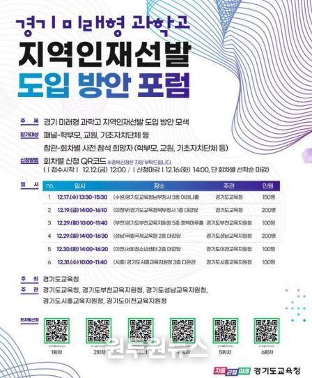(원투원뉴스) 경기도교육청이 새롭게 전환·설립하는 ‘경기 미래형 과학고 지역 인재 선발 도입 방안 포럼’을 개최한다.