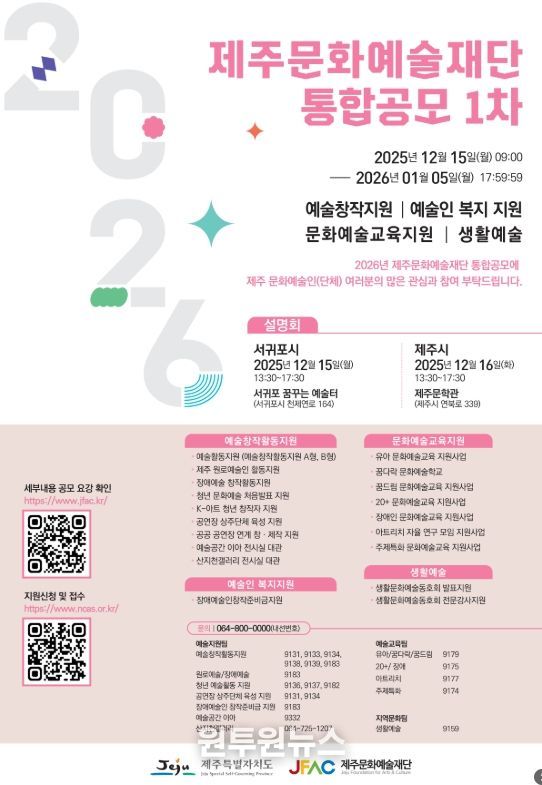 (원투원뉴스) 제주문화예술재단(이사장 김석윤)은 2026년도 지원사업 1차 통합공모를 실시한다. 접수 기간은 2025년 12월 15일부터 2026년 1월 5일까지이며, 문화예술교육 지원사업은 2026년 1월 9일까지 접수한다.