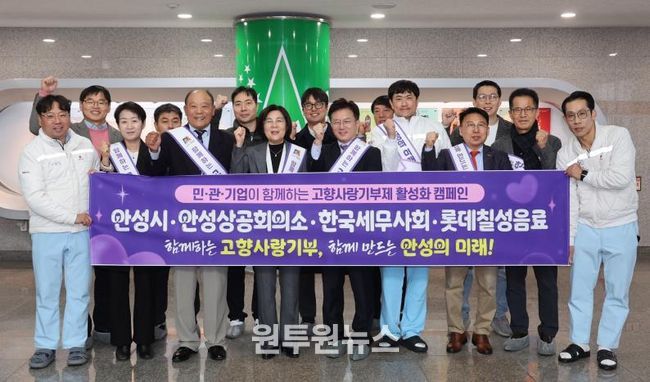(원투원뉴스) 안성시는 15일 롯데칠성음료 안성공장에서 안성상공회의소 및 한국세무사회와 함께 고향사랑기부제 활성화를 위한 협력 의지를 공유하고, 민·관·기업이 힘을 모아 제도 확산에 동참하겠다는 공동 메시지를 전달했다고 밝혔다.