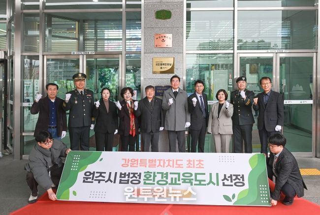 (원투원뉴스) 원주시는 12월 16일 시청사 입구에서 강원특별자치도 최초 ‘환경교육도시’지정을 기념하기 위한 현판 제막식을 개최했다.