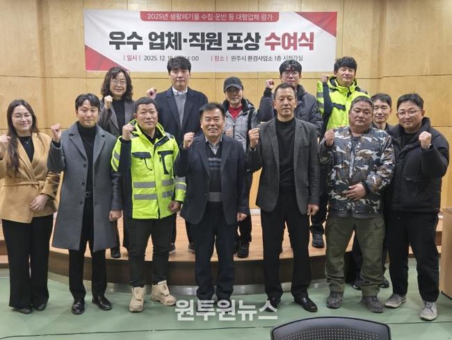 (원투원뉴스) 원주시는 12월 16일 '2025년 생활폐기물 수집ㆍ운반 대행업체 평가결과'에 따른 우수등급 업체 및 소속 직원을 대상으로 원주시장 상장 및 표창장을 수여한다.