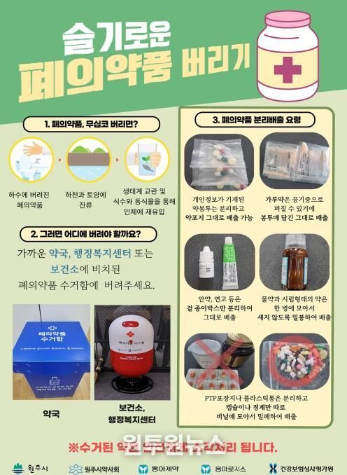 (원투원뉴스) 원주시는 가정에서 배출되는 유통기한 지난 폐의약품을 안전하게 처리하기 위하여 올바른 분리배출 방법 홍보에 나섰다.