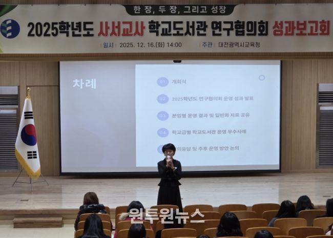 (원투원뉴스) 대전시교육청은 12월 16일 대전 관내 사서교사 및 학교도서관·독서교육 담당 교사를 대상으로 ‘2025학년도 사서교사 학교도서관 연구협의회 성과보고회’를 개최했다고 밝혔다.