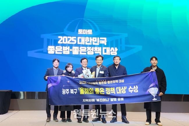 (원투원뉴스) 광주광역시 북구가 ‘2025년 좋은법·좋은정책 대상’ 시상식에서 지역화폐 부끄머니 발행 사례가 ‘올해의 좋은정책 대상’으로 선정됐다고 17일 밝혔다.