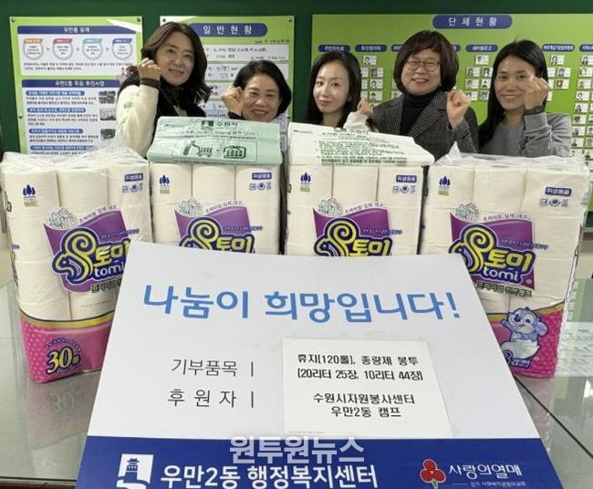 특히 휴지 120롤은 1년 동안 아파트 단지 내에서 주민들과 함께 모은 우유팩을 정수연 봉사자가 직접 씻고 말리는 과정을 거쳐, 행정복지센터의 ‘유용 생활폐자원 교환사업’을 통해 두루마리 휴지로 교환한 뒤 기부한 것으로 의미를 더했다.