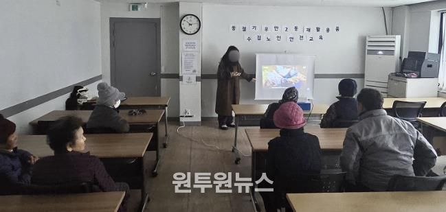 이번 교육은 재활용품 수집 과정에서 발생할 수 있는 교통사고 및 안전사고를 예방하고, 한파에 취약한 어르신들의 건강관리를 돕기 위해 마련됐으며, 안전 관련 동영상 시청을 통해 차도 통행에서 발생할 수 있는 사고 위험성을 안내하고, 재활용품 수집 시 유의 사항과 동절기 한파 대비 건강관리 요령을 중심으로 설명이 이루어졌다.