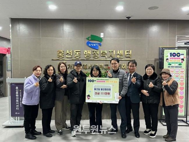 (원투원뉴스) 의정부시 흥선동 행정복지센터는 12월 16일 흥선동통장협의회가 ‘100일간 사랑릴레이 배턴 잇기’에 동참해 관내 어려운 이웃들을 위한 성금 111만 원을 기탁했다고 밝혔다.