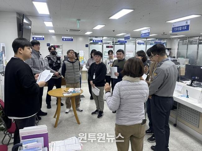 (원투원뉴스) 구리시 교문1동 행정복지센터는 지난 12월 15일 교문1동 행정복지센터 1층에서 민원 현장에서 발생할 수 있는 폭언·폭행 등 특이 민원 상황에 효과적으로 대응하기 위한 ‘2025년 하반기 특이 민원 대응 모의훈련’을 실시했다.