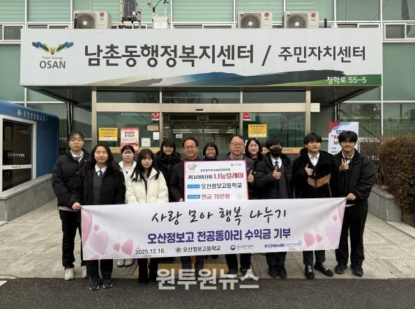 (원투원뉴스) 오산시 남촌동행정복지센터는 지난 16일 오산정보고등학교 전공동아리 학생들과 주훈지 교장, 담당교사 등이 참석한 가운데 관내 저소득층 지원을 위한 바자회 판매 수익금 70만 원을 기탁받았다고 밝혔다.