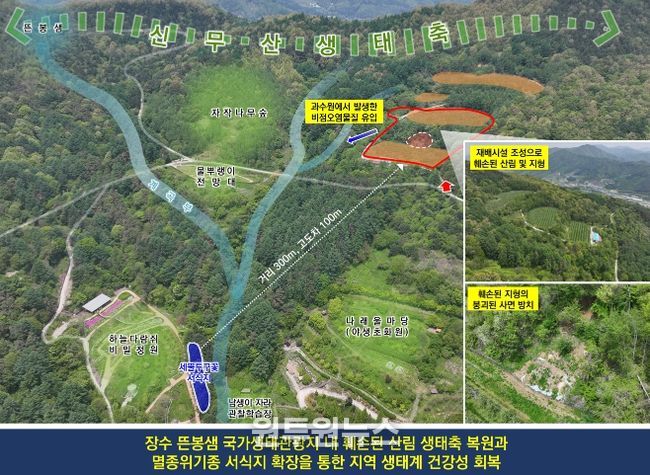 장수군은 이번에 확보한 국비 4억5천만 원을 활용해 뜬봉샘 국가생태관광지 내 과거 개간사업으로 조성된 폐과수원 일원을 중심으로 훼손된 산림과 지형을 복원하고 단절된 산림 생태축을 회복할 계획이다.