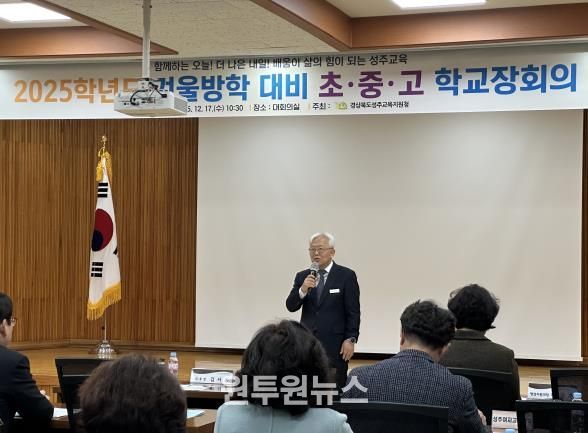 (원투원뉴스) 경상북도성주교육지원청은 12월 17일, 성주교육지원청 대회의실에서 관내 초·중·고등학교 학교장을 대상으로 ‘2025학년도 겨울방학 대비 학교장 회의’를 개최했다.