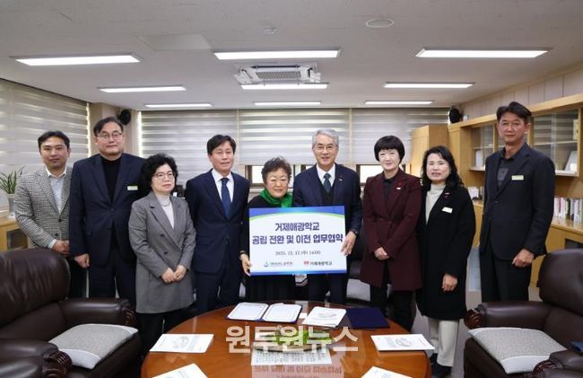 (원투원뉴스) 경상남도교육청은 17일 본청 교육감 집무실에서 사회복지법인 거제도애광원과 ‘거제애광학교 공립 전환 및 이전 업무 협약’을 체결했다.