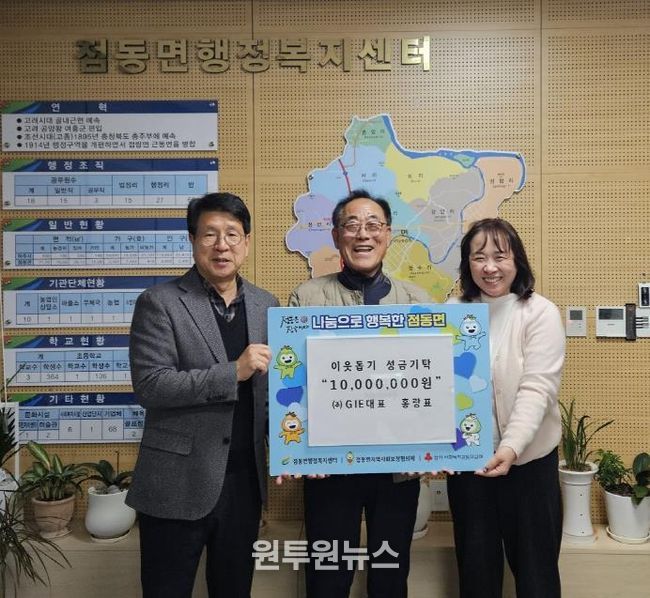 (원투원뉴스) 점동면은 (주)GIE 대표 홍광표가 2025년 한 해 동안 점동면에 총 30,000,000원의 기부금을 기탁하며, 지역사회 발전과 취약계층 지원을 위한 꾸준한 나눔을 실천하고 있다고 밝혔다.