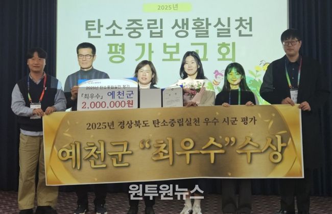 (원투원뉴스) 예천군은 19일 구미 호텔금오산에서 열린 ‘2025년 탄소중립실천 우수시군 평가보고회’에서 ‘최우수상’을 수상했다.
