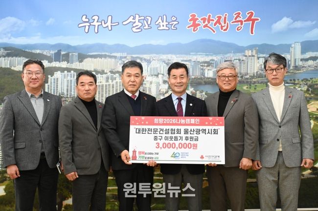 (원투원뉴스) 대한전문건설협회 울산광역시회(회장 조현철)가 12월 19일 오후 2시 중구청 구청장실을 찾아 울산사회복지공동모금회를 통해 이웃돕기 후원금 300만 원을 전달했다.