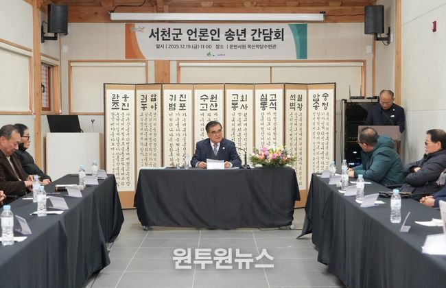 (원투원뉴스) 서천군은 지난 19일 문헌서원 이개충의관에서 지역 출입 언론인을 초청해 ‘2025년 서천군 언론인 송년간담회’를 열고, 민선 8기 4년간의 군정 성과와 2026년 군정 운영 방향을 공유했다.