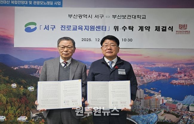 (원투원뉴스) 부산 서구는 지난 19일 부산보건대학교와 '서구 진로교육지원센터 '민간 위탁 운영에 따른 위‧수탁 계약 체결식을 가졌다. 이번 계약으로 서구 진로교육지원센터는 2026년 1월 1일부터 2028년 12월 31일(3년)까지 부산보건대학교에서 위탁받아 운영한다.