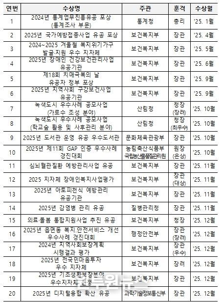 수상 내역을 살펴보면 분야별 ▲ 보건․의료 9건, ▲ 사회복지 5건, ▲ 일반행정 3건, ▲ 환경 2건, ▲ 농업 1건으로, 주민의 삶의 질과 직결되는 보건 복지 분야에서 특히 두드러진 성과를 보였다.