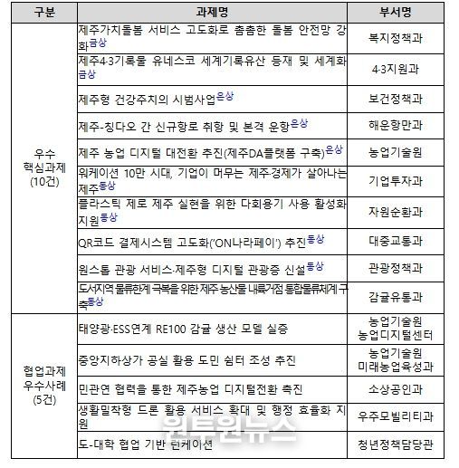 이 가운데 상위 5개 과제가 이날 발표 심사를 거쳐 최종 순위를 가렸으며, ‘제주4·3기록물 유네스코 세계기록유산 등재 및 세계화’와 ‘제주가치돌봄 서비스 고도화로 촘촘한 돌봄 안전망 강화’ 과제가 금상을 차지했다.