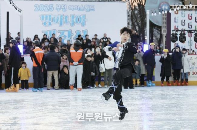 (원투원뉴스) 부천시는 지난 19일, 부천종합운동장 잔디광장에 새롭게 조성된 ‘부천 아이스월드 빙파니아’의 개장식을 열었다. 이날 행사에는 부천시 피겨스케이팅 유망주 이윤호 선수의 축하 공연과 시민 대상 무료 스케이팅 체험이 함께 진행돼, 개장을 기다려온 시민들의 발걸음이 이어졌다. 빙판 위를 밝히는 조명과 경쾌한 음악이 어우러져, 현장은 마치 겨울 축제가 열린 듯 활기찬 분위기로 가득 찼다.