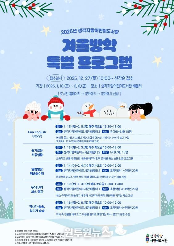 (원투원뉴스) 원주시 생각자람어린이도서관은 유아부터 초등학생을 대상으로 ‘겨울방학 특별 프로그램’을 운영한다.