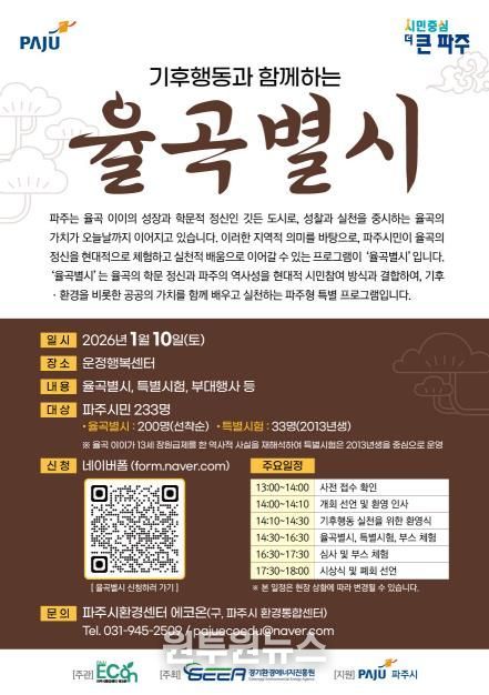 (원투원뉴스) 파주시환경센터 ‘에코온’은 파주를 대표하는 조선시대 사상가 율곡 이이의 학문 정신을 현대적 기후행동 가치로 재해석한 기후문화축제 ‘기후행동과 함께하는 율곡별시’를 오는 내년 1월 10일 운정행복센터에서 개최한다.