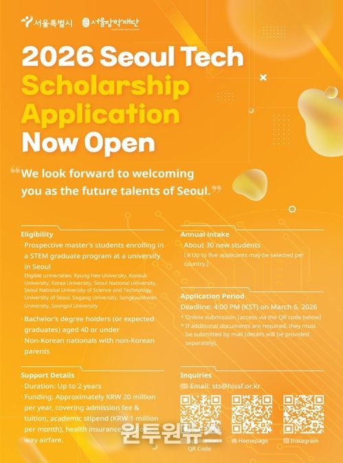 (원투원뉴스) 서울장학재단이 기존 개발도상국 중심이던 지원 자격을 국적 제한 없이 전면 개방하고, '2026년 서울테크스칼러십(Seoul Tech Scholarship)' 장학생 30명을 선발한다. 서울의 미래 산업을 이끌 글로벌 이공계 우수 인재를 서울로 적극 유치하기 위한 전략이다.