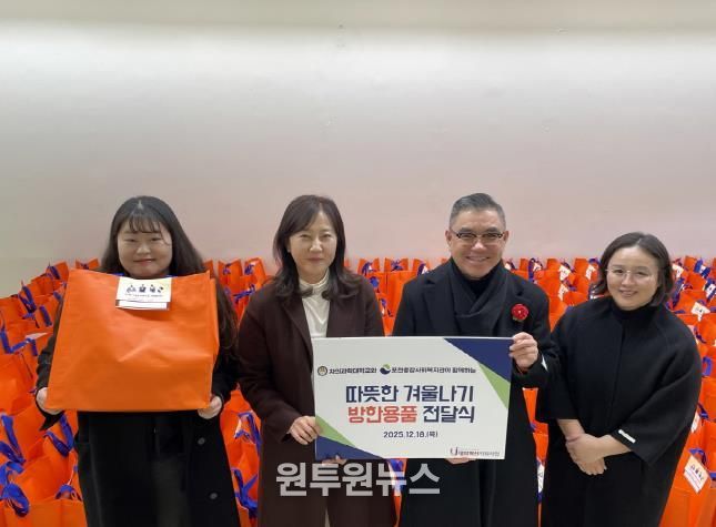 (원투원뉴스) 포천시종합사회복지관과 차의과학대학교는 지난 18일 차의과학대학교 사회봉사센터에서 따뜻한 겨울나기를 위한 ‘2025년 사랑의 방한용품 나눔’ 전달식을 진행했다.