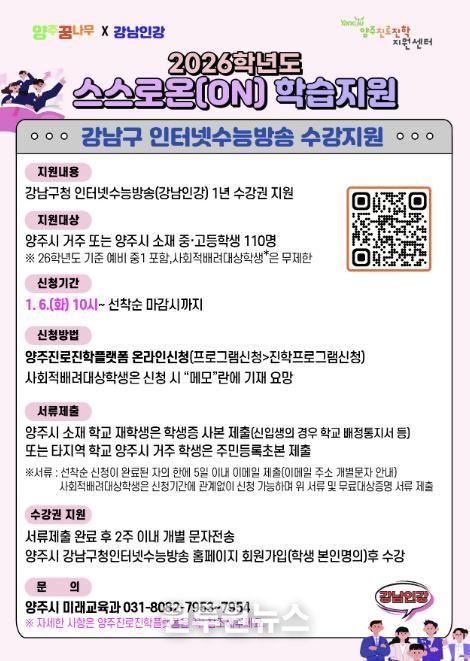 이번 강남인강 수강권 지원 사업은 1월 6일 오전 10시부터 양주진로진학플랫폼을 통해 선착순으로 신청을 받는다.