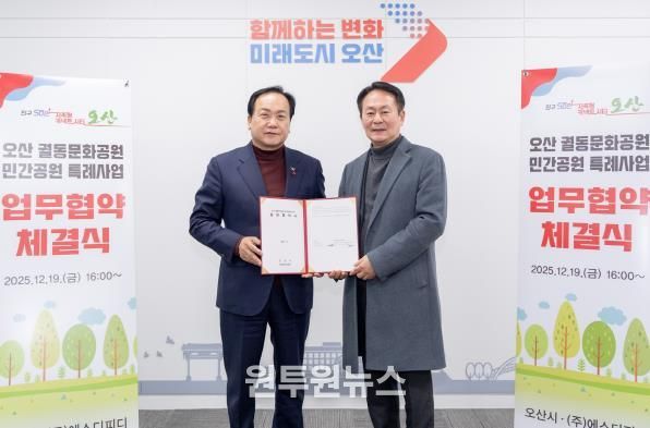 (원투원뉴스) 오산시는 12월 19일 오산시청에서 궐동문화공원 민간공원조성 특례사업의 원활한 추진을 위해 사업 시행자인 ㈜에스디피디와 협약을 체결했다.