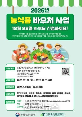 (원투원뉴스) 무안군은 2025년 12월 22일부터 2026년 농식품 바우처 지원사업 신청접수를 시작한다고 밝혔다.