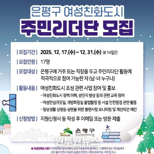(원투원뉴스) 서울 은평구는 여성친화도시 조성을 위해 함께 할 ‘여성친화도시 주민리더단’ 단원을 새로 모집한다고 밝혔다.