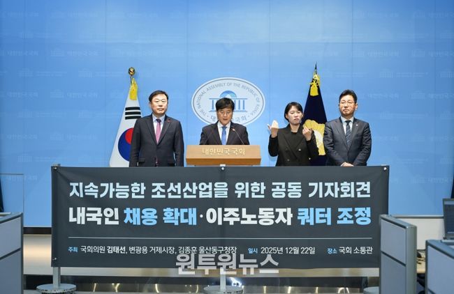 (원투원뉴스) 변광용 거제시장은 지난 22일 김태선 국회의원(울산동구, 환경노동위), 김종훈 울산 동구청장과 함께 국회 소통관에서 기자회견을 열고, ‘조선산업기본법’ 제정, 내국인 채용 확대, 외국인 쿼터 축소를 골자로 한 고용구조 전환의 필요성을 정부에 촉구했다.