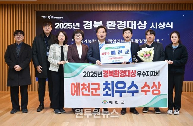 (원투원뉴스) 예천군은 22일 경상북도 주관 ‘2025년 경북환경대상’ 평가에서 최우수상을 수상하며 환경 전반에 걸친 우수한 정책 추진 성과를 인정받았다.