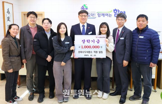 아울러 함양군청 상하수도사업소는 ‘2025년 노후상수관망정비사업 사후관리평가’에서 전국 최우수 지자체로 선정돼 기후에너지환경부 장관 표창을 받았으며, 일반수도사업자 운영·관리 실태점검 평가에서도 5년 연속 최우수 등급을 유지하는 성과를 거뒀다. 이에 상하수도사업소 직원들은 뜻을 모아 장학금 100만 원을 기탁하며 연말 나눔에 동참했다.