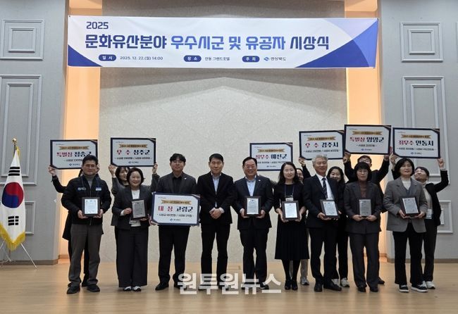 (원투원뉴스) 경상북도는 22일 안동 그랜드호텔에서 문화유산 보존과 활용 분야에서 탁월한 성과를 거둔 7개 시군을 선정해 ‘2025년 문화유산 분야 우수 시군’시상식을 개최하고 그간의 노고를 격려했다.