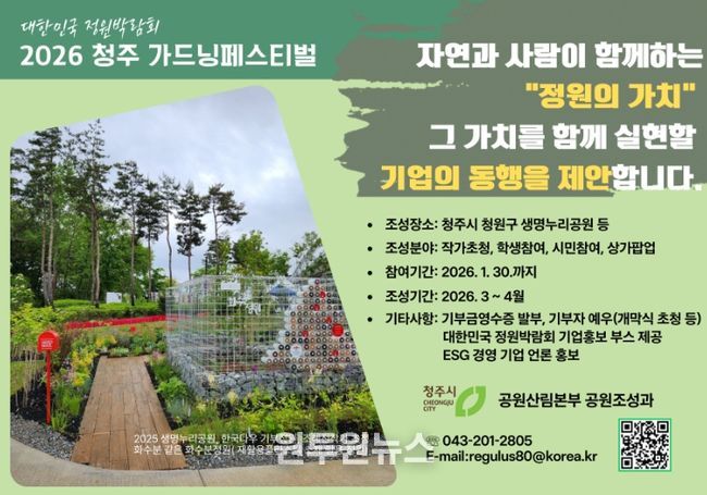 (원투원뉴스) 청주시는 정원문화와 정원산업 활성화를 위해 2026년 5월 생명누리공원에서 열리는 ‘대한민국 정원박람회 2026 청주 가드닝페스티벌’에 함께할 ESG 경영 기업을 모집한다고 22일 밝혔다.