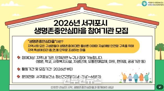(원투원뉴스) 서귀포보건소는 2026년 생명존중안심마을에 새롭게 함께할 참여기관을 모집한다고 밝혔다. 생명존중안심마을은 마을별 생명존중 네트워크를 형성하는 핵심 사업으로, 보건의료․교육․사회복지․지역사회․공공기관의 5가지 영역별 참여기관이 함께하며 마을 내 생명존중 문화 조성을 위해 협력하는 사업이다.