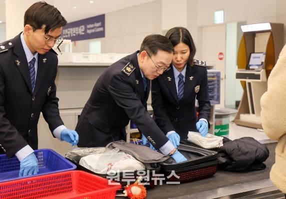 (원투원뉴스) 관세청은 22일 이명구 관세청장이 인천공항을 찾아, 여행자 휴대품 검사관들과 함께 우범 수하물 선별 및 개장검사, 우범여행자 신체 및 밀리미터파 검색기 운용 등 마약 검사업무를 직접 수행하며 여행자 분야 마약 단속 현장을 점검하고, 지난 5일 발표한 ‘관세청 마약 단속 종합 대책’의 철저한 이행을 주문했다고 밝혔다.