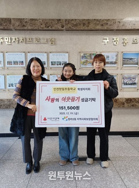 (원투원뉴스) 인천 청일초등학교는 지난 19일 청라2동 행정복지센터를 방문해 관내 어려운 이웃을 위해 사용해 달라며 성금 15만1천 원을 전달했다.