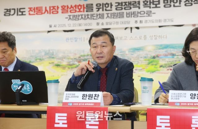 (원투원뉴스) 경기도의회 경제노동위원회 소속 한원찬 의원(국민의힘, 수원6)은 22일 수원특례시 팔달구청 대강당에서 개최된 ‘경기도 전통시장 활성화를 위한 경쟁력 확보 방안 정책 토론회’에 토론자로 참석했다. 이번 토론회는 지방정부의 전통시장 및 상점가 육성을 위한 지원 방안 개선책을 모색하고, 경기도 전통시장이 단순한 활성화를 넘어 실질적인 경쟁력을 확보하기 위한 전략을 논의하고자 마련됐다.