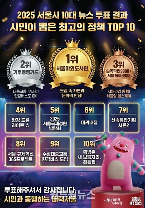 울시는 12월 19일까지 진행한 ‘2025 서울시 10대 뉴스’ 투표에서 ‘서울야외도서관’이 11만 2762표(17.1%)로 1위를 차지했다고 밝혔다. 2위는 ‘기후동행카드(11만927표, 16.9%)’, 3위는 ‘손목닥터9988+서울체력9988(8만9845건, 13.7%)’ 였다.