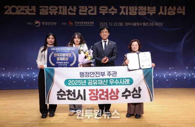 (원투원뉴스) 순천시는 지난 22일 행정안전부 주관으로 정부서울청사에서 열린 ‘2025년 공유재산 우수 지방단체 시상식’에서 공유재산 우수사례 경진대회 부분 ‘장려상’을 수상했다고 밝혔다.