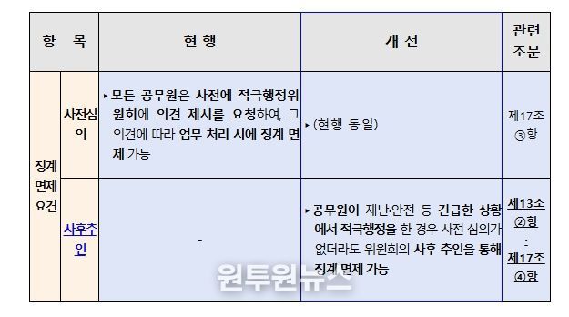 기존에는 기관별 설치된 적극행정위원회의 사전 심의를 거쳐 업무를 처리한 경우에만 징계 면제가 가능했으나 긴급한 재난 상황 등에서는 사전심의를 받기가 사실상 어려운 현실을 반영해 사후에도 징계 면제가 가능토록 개선했다.