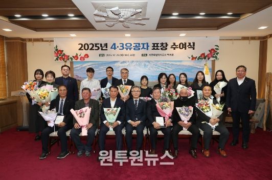 (원투원뉴스) 진명기 행정부지사는 23일 오전 10시30분 도청 백록홀에서 ‘2025년도 4·3유공자 표창 수여식’을 개최하고 제주4·3진상규명 및 4·3희생자 및 유족 명예회복 등에 기여한 도민과 공무원 22명에게 도지사 표창을 수여했다.