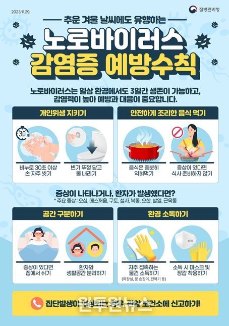 또한 노로바이러스 감염증 환자는 증상이 사라진 이후에도 최소 48시간 동안 등원, 등교, 출근을 자제하고 환자가 사용한 공간과 화장실 등 생활공간을 구분해 사용하는 것이 권장된다.