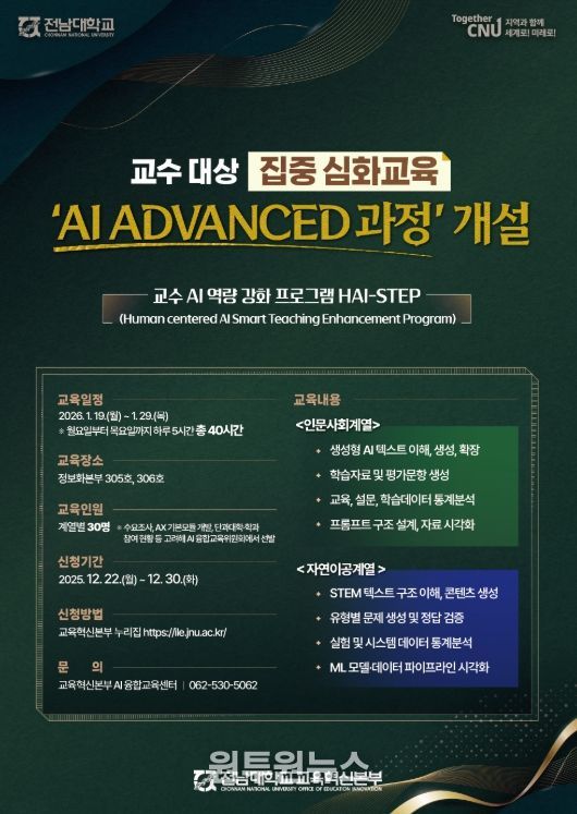 (원투원뉴스) 전국 대학 최초로 AI 캠퍼스 대전환을 추진한 전남대학교가 교수들의 AI 활용 역량을 체계적으로 강화하기 위한 단계별 교육 프로그램을 본격 운영한다.